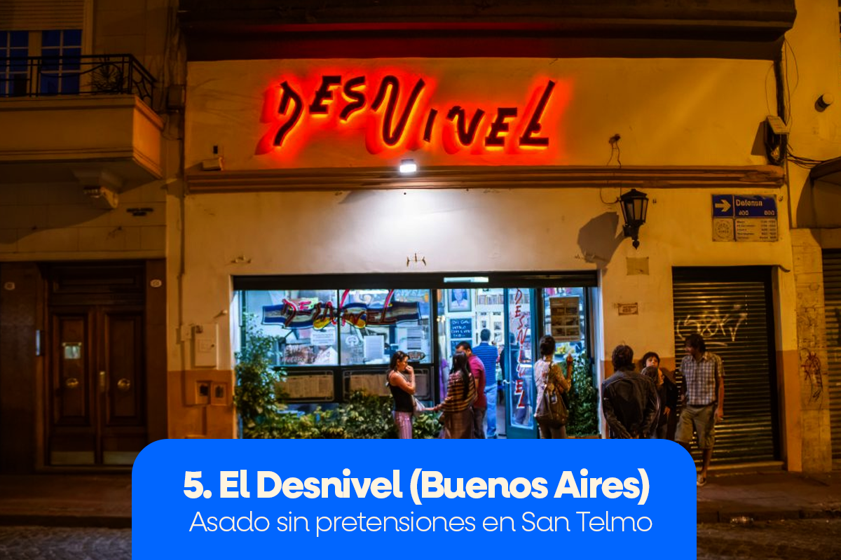 Rústico, auténtico y con precios amigables, El Desnivel es un clásico para quienes quieren disfrutar de un buen asado sin lujos innecesarios. La entraña y la provoleta son imperdibles.